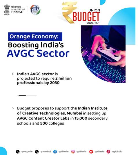 With the emerging technologies playing a pivotal role in India’s Orange Economy, the Budget underscores India’s Animation, Visual Effects, Gaming and Comics (AVGC) sector as a growing industry projected to require 2 million professionals by 2030.The Union Budget proposes to support the Indian Institute of Creative Technologies, Mumbai in setting up AVGC Content Creator Labs in 15,000 secondary schools and 500 colleges in furtherance of India’s Orange economy.