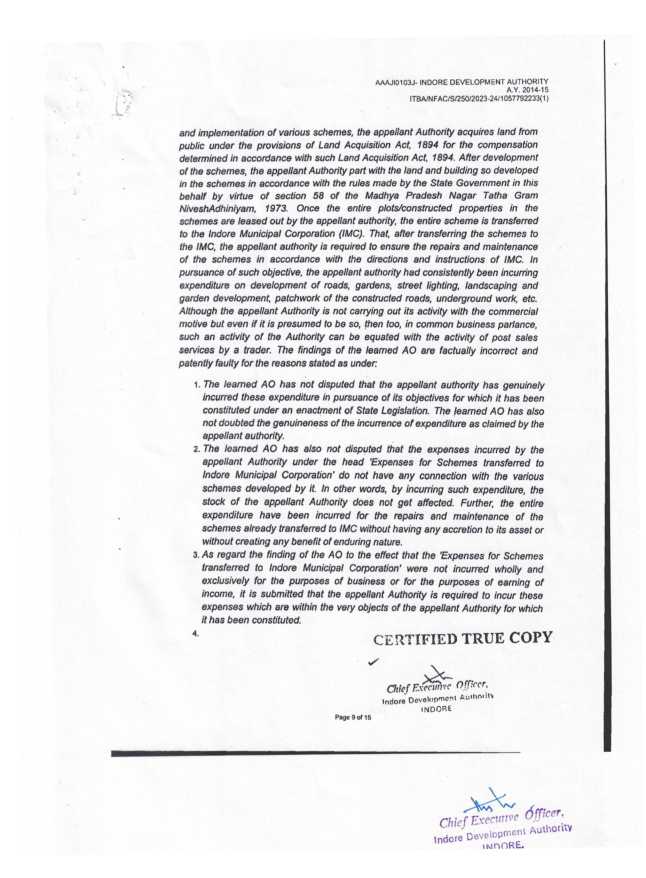 | 14. | | We observe that the primary object of the assessee is to implement development plan, prepare one or more town development schemes and develop of land in accordance with Rules made by the State Government, by virtue of section 58 of the Madhya Pradesh Nagar Tatha Gram Nivesh Adhiniyam, 1973. The assessee authority also undertakes to carry out the development work of general in nature which is utilized by the public at large. Such expenses have been consistently incurred by the assessee in the past also and such claim have been allowed by the revenue authorities after conducting scrutiny assessment proceedings u/s 143(3) of the Act for the year under appeal. |