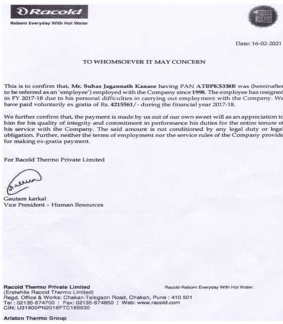 10. We further find that under identical facts & involving the similar issue a coordinate bench of this Tribunal in the case of Mahadev Vasant Dhangekar (supra) has already hold that ex-gratia payment paid by Racold Thermo Private Limited to its employee is not taxable by observing as under :-