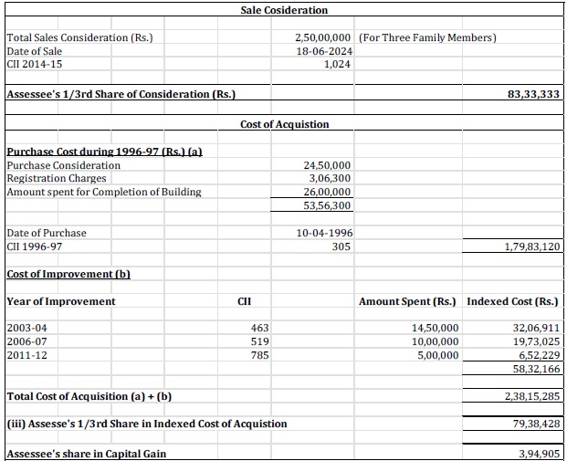 5.1 In response to the notice issued u/s 142(1) of the Act, the assessee submitted that assessee had an immovable property which was sold for a total consideration of Rs. 2.5 crore, in which the assessee held a 1/3rd share. The Capital gain arising from such transaction was calculated by the assessee as follows: