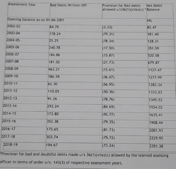 7. The ld. AR on the other hand submitted that the impugned issue has been consistently held in favour of the assessee by the Co-ordinate Bench from AY 2004-05 and that the Department has not preferred further appeal against the order of the Tribunal. The ld. AR accordingly submitted that the issue has reached finality. The ld. AR on merits submitted that the ground on which the AO made the disallowance is that the bad-debts claimed under section 36(1)(vii) cannot exceed the credit balance in the provision for bad and doubtful debts under section 36(1)(viia)(c) of the Act. The ld. AR further submitted that the assessee in earlier years has established the fact that there is no credit balance in the provisions account and therefore the question of applying the proviso to section 36(1)(vii) does not arise. In this regard the ld. AR drew our attention to the following table which includes the details pertaining to the year under consideration also –