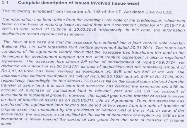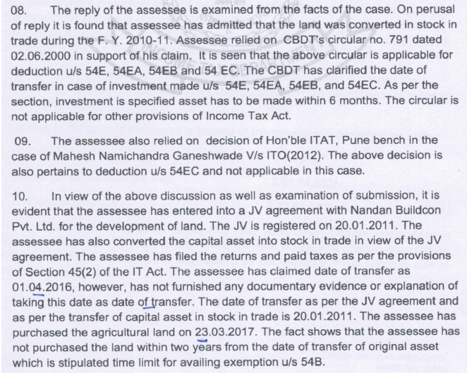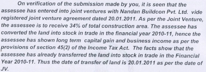 3. During the course of assessment proceedings the Assessing Officer noted that the assessee had entered into a joint venture agreement with M/s. Nandan Buildcon Pvt Ltd vide registered joint venture agreement dated 20.01.2011. As per the agreement M/s. Nandan Buildcon Pvt Ltd has agreed for the construction of residential houses on the land of the assessee and the assessee in lieu of this JV agreement will get 34% of construction area. The terms and conditions of the agreement clearly show that the assessee has transferred the land to the developers for development purpose and the joint venture agreement is also a registered agreement. He noted that the assessee has converted his agricultural land as stock in trade and is paying tax on the capital gain and tax on business income as per the provisions of section 45(2) of the Act. This fact, according to the Assessing Officer, clearly shows that the assessee has transferred his capital asset into stock in trade in view of the Joint Venture agreement dated 20.01.2011. He, therefore, was of the view that the land is transferred in the financial year 2010-11 itself. However, the assessee has claimed deduction of Rs.289,64,823/- u/s 54B of the Act.