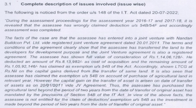 4. The Assessing Officer noted that the assessee has claimed the date of transfer of original asset as 01.04.2016. However, no explanation was submitted regarding how date of transfer of asset is taken as 01.04.2016 when the land was transferred as per the JV agreement dated 20.01.2011 and subsequently the land is converted into stock in trade on this date. From the various explanations furnished by the assessee he noted that the assessee during the assessment year 2014-15 has already claimed deduction u/s 54B of the Act at Rs.1,05,92,146/- on the capital gains derived from the transfer of the same land. Further, the assessee has claimed exemption u/s 54B on account of purchase of agricultural land in relevant assessment year whereas on verification of the sale deed of agricultural land it is found that the sale deed is registered on 23.03.2017. Thus, the assessee has purchased the agricultural land beyond the period of two years from the date of transfer of original asset as mandated by the provisions of section 54B of the Act. He, therefore, issued a show cause notice asking the assessee to explain as to why the deduction claimed u/s 54B of the Act should not be rejected. Rejecting the various explanations given by the assessee the Assessing Officer disallowed the claim of deduction u/s 54B of the Act of Rs.2,89,64,823/- made by the assessee by observing as under: