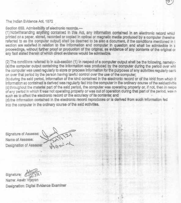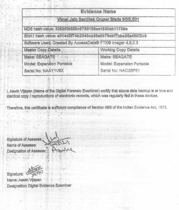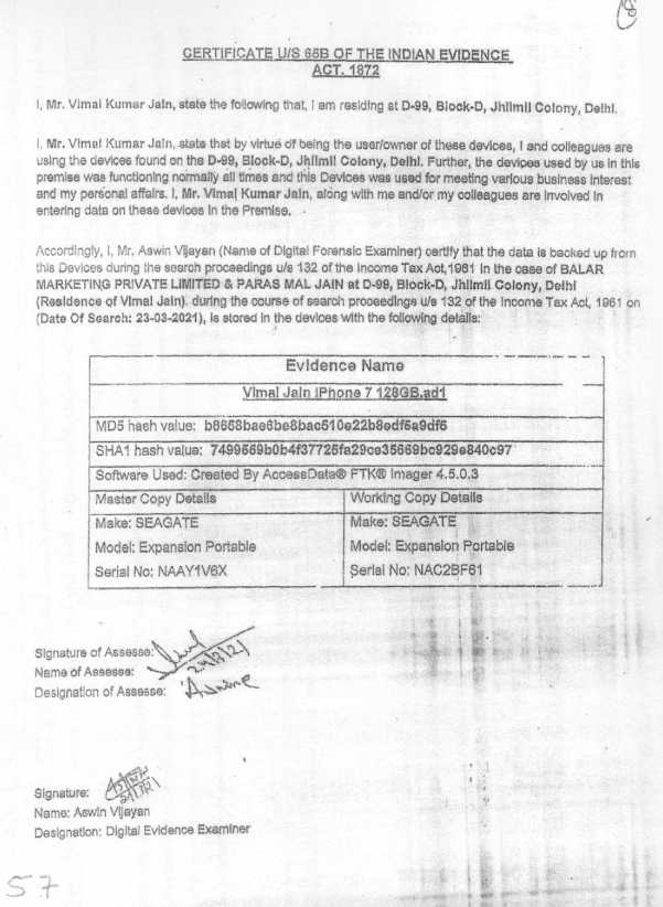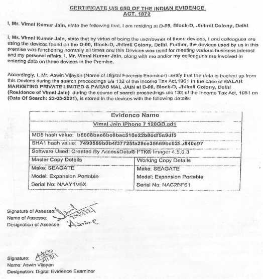 28. Further, as we examine the copy of so called65B certificate said to given by Mr. Vimal Jain, the same is shown to be dated 24.03.2021. This certificate at one end merely mentions an undertaking that Mr. Vimal Jain was the owner and user of these device. At the other end, this certificate given u/s 65B of the Evidence Act is shown to be given by Mr. AshwinVijayan, Digital forensic examiner who merely certifies that the data is backed up from the seized phones and stored in the target device with relevant details of phone and target device mentioned in the certificate. This certificate is therefore just about process of collection of digital evidences and cloning being followed at time of search. It nowhere mentions of extraction of data which was used later for appraisal report or in assessment. There is no mention in these certificates not there are other certificate to show as to when and how the working copy was examined at time of preparation of appraisal report or assessment. Apart from these documents prepared on 24.03.2021, there is no document showing as to how and in what circumstances and by whom the working copy was accessed, data retrieved, extracted and reproduced for the purpose of preparing the appraisal report by the Investigation Wing and if at all the working copy was made over to the AO, to make necessary extractions and then use them for recording statement and to reproduce in the assessment order.Thus it becomes questionable as to this e-Certificate at all serves any purpose and adds to the veracity of digital evidences.