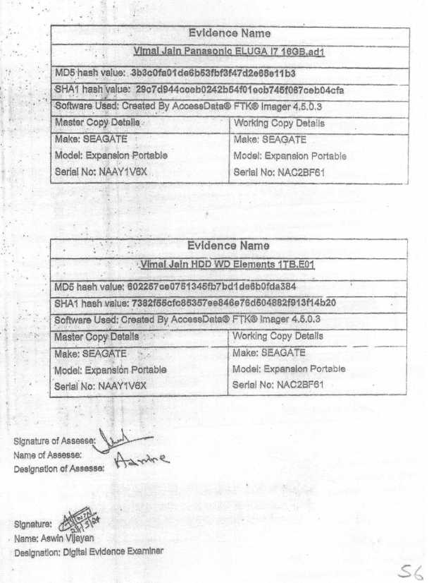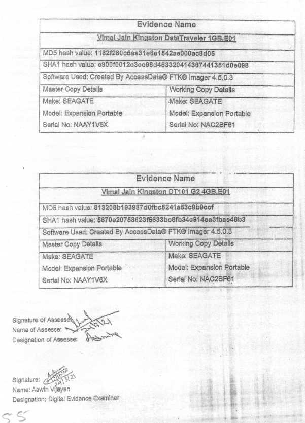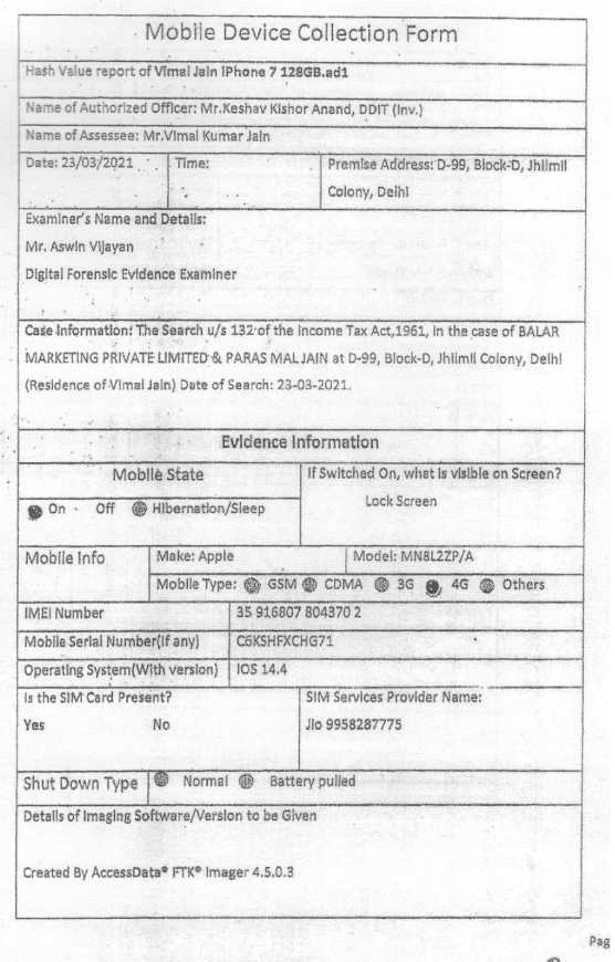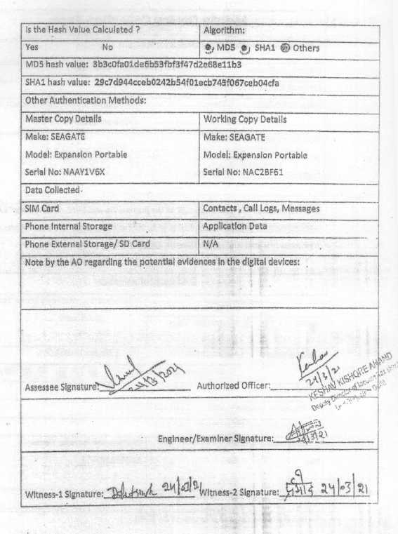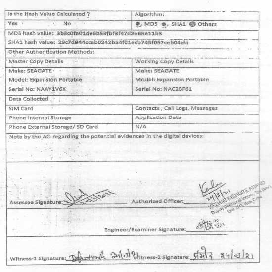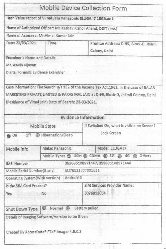27. The Revenue has then relied mobile device collection form of two phones and they make it apparent that the mobile collection forms are dated 23.03.2021 while signatures of the Mr. Vimal Jain, authorized officer, Forensic examiner and two witnesses are dated 24.03.2021. Time column in the form is left blank. Mobile device collection form does mention MD5 hash value and SHA1 hash value of the two devices, which were impounded at the time of seizure of these devices and hash value of one external drive used to copy the content of all the digital devices seized.