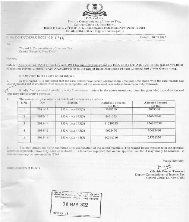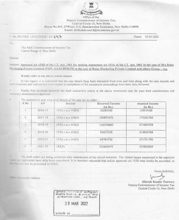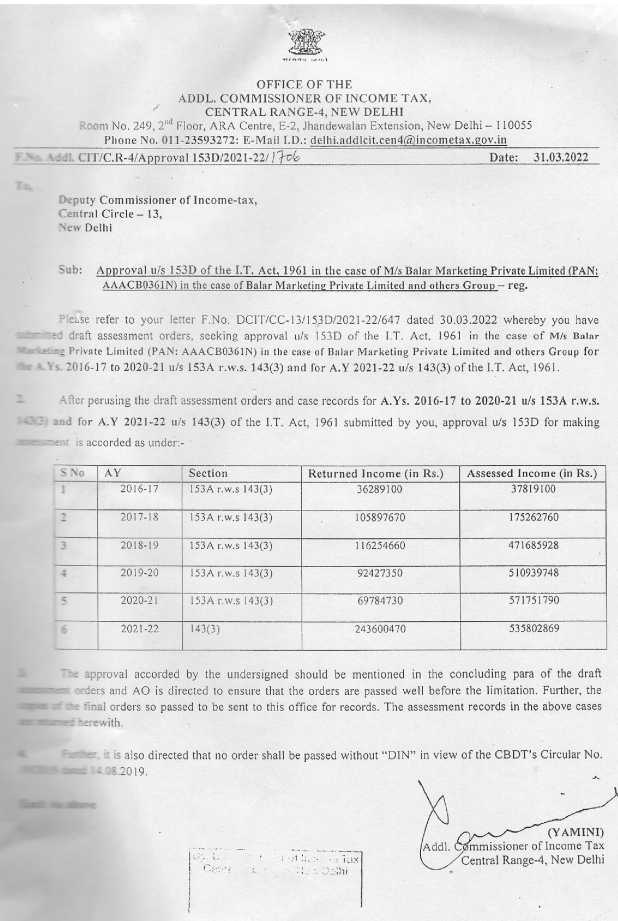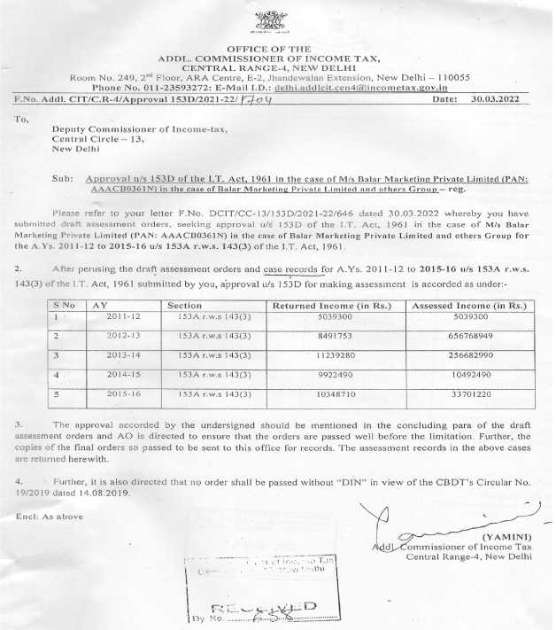 42. Connected to the aforesaid is the second issue of validity of approval granted u/s 153D of the Act and as we examine the assessment orders, we find that the same are very long assessment orders with numerous annexures and even lengthy statements of Mr. Vimal Jain and Mr. Parasmal Jain. However, what comes up is that on 30.03.2022, DCIT, Central Circle-13, New Delhi, vide letter F.No.DCIT/CC-13/153D/2021-22/646 sought approval u/s 153D of the Act. As for the sake of convenience the same are reproduced:-