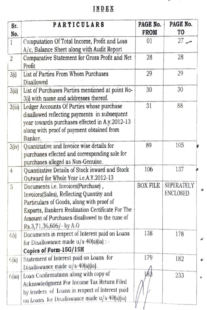 3.3. Aggrieved, assessee went in appeal before the ld. CIT(A). Assessee made all the submissions and explanations along with corroborative documentary evidences. In this respect, index of the paper book containing 233 pages furnished before the ld. CIT(A) under an acknowledged rubber stamp dated 06.04.2016 is extracted below, which is also placed in the paper book before us.