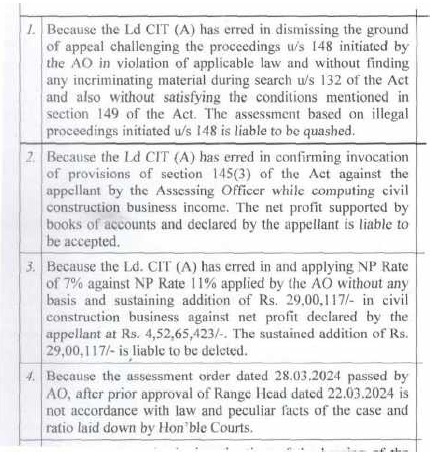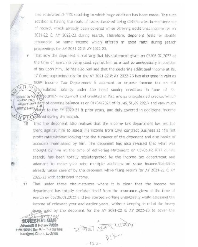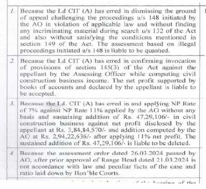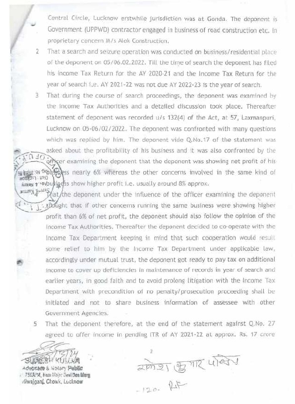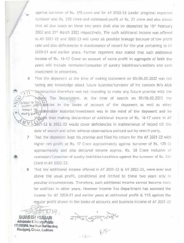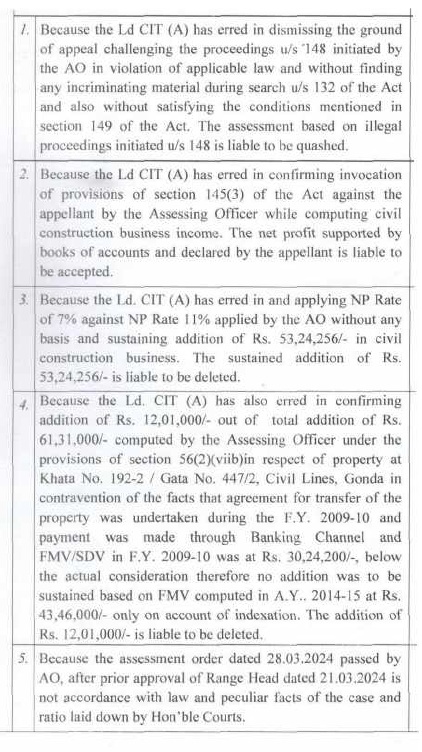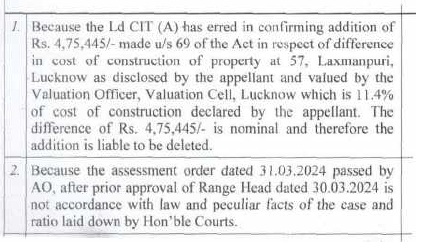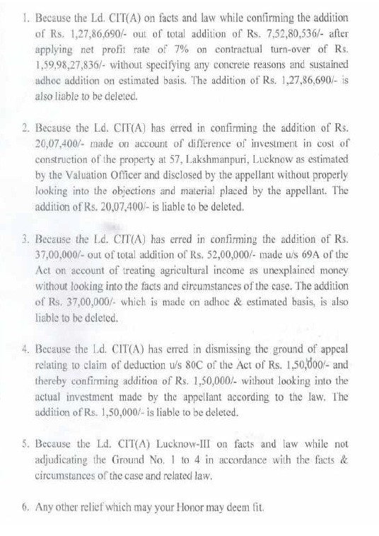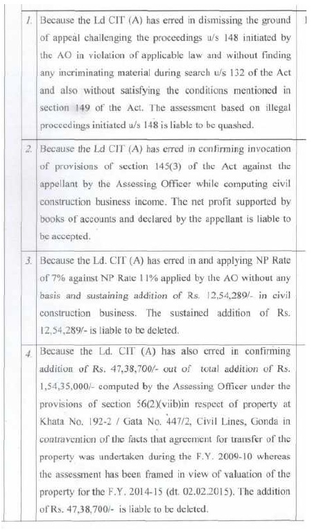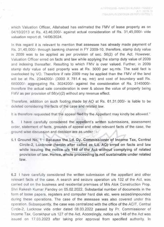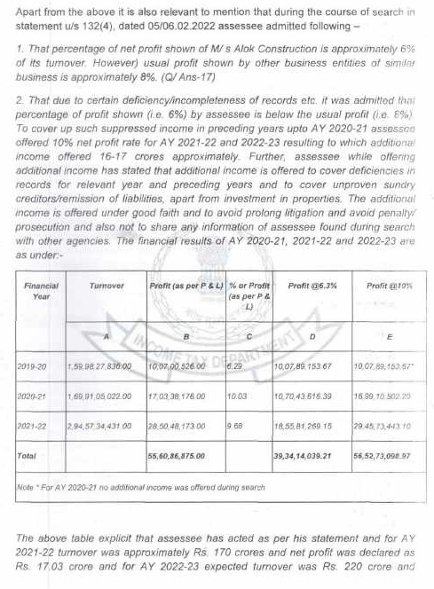 | 1. | | That a search and seizure operation u/s 132 of the Income Tax Act was carried out on 05.02.2022 on the business and residential premises of M/s Alok Construction being proprietary concern of Appellant. The assessee is Government Contractor and during the relevant period, the assessee engaged in proprietorship business of construction of road etc. in semi urban area from contract work provided by the UPPWD, under the name and style of M/s Alok Construction. |