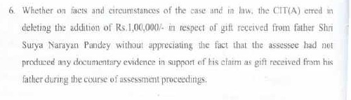 (L.2) The next issue raised in Revenue’s appeal is regarding addition of Rs.1,00,000/- on account of gift taken by the assessee from his father. The learned CIT(A) has deleted the addition in her impugned appellate order. At the time of hearing learned D.R. relied on the assessment order whereas learned A.R. for the assessee relied on the order of learned CIT(A). The Learned A.R. for the assessee also placed reliance on written submissions made on this issue, as referred to in foregoing paragraphs (B.1), (B.2), (B.2.1) and (B.3) of this order. We find that the order of learned CIT(A) on this issue is just and reasonable having regard to the applicable law and facts of the case. Therefore, on this issue, the ground taken by Revenue is dismissed and order of the learned CIT(A) is upheld.
