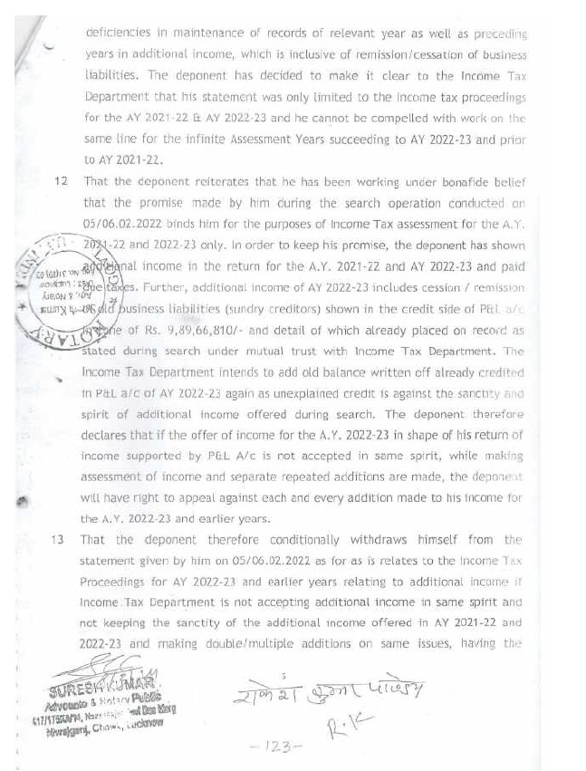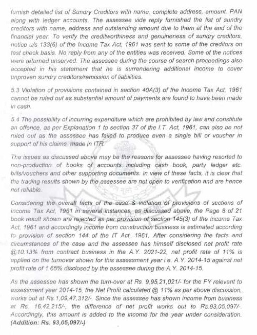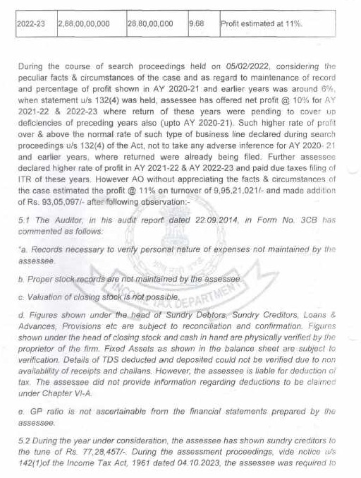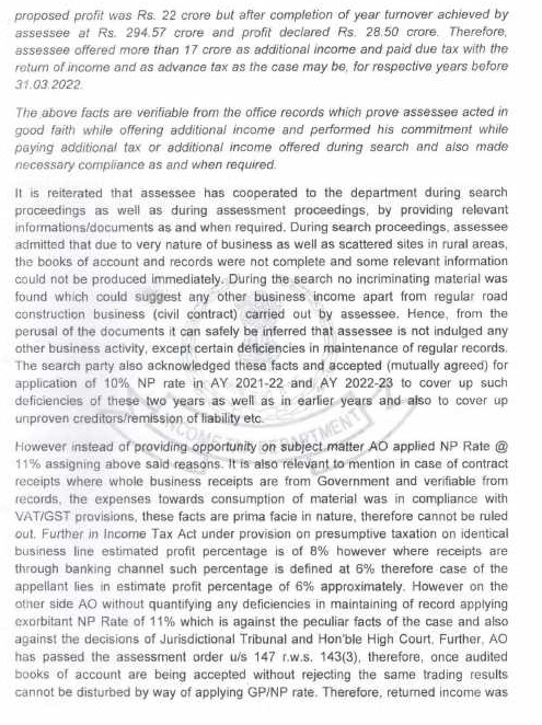 That due to certain deficiency/incompleteness of records etc. it was admitted that percentage ofprofit shown (i.e. 6%) by assessee is below the usual profit (i.e. 8%). To cover up such suppressed income in preceding yearsupto AY 2020-21 assessee offered 10% net profit rate for AY 2021-22 and 2022-23 resulting to which additional income offered 16-17 crores approximately. Further, assessee while offering additional income has stated that additional income is offered to cover deficiencies in records for relevant year and preceding years and to cover unproven sundry creditors/remission of liabilities, apart from investment in properties. Further, no adverse inference may be drawn w.r.t. extra profits and seized documents for years prior to AY 2021-22.