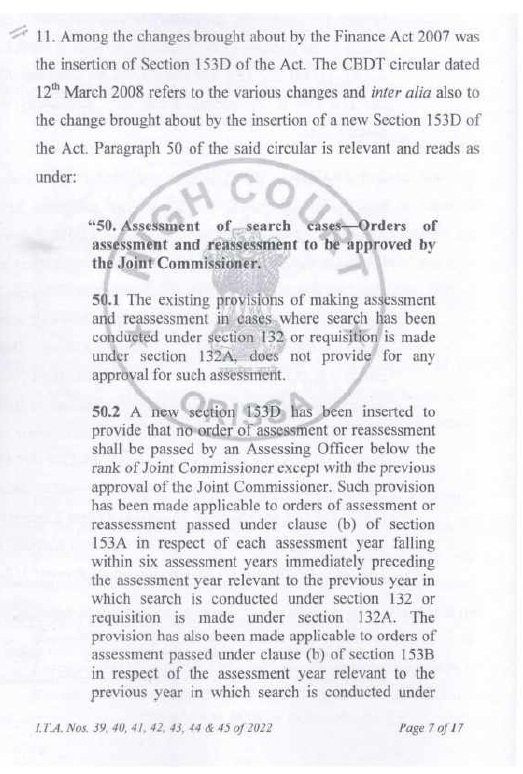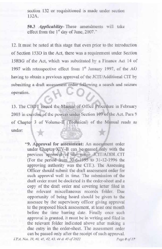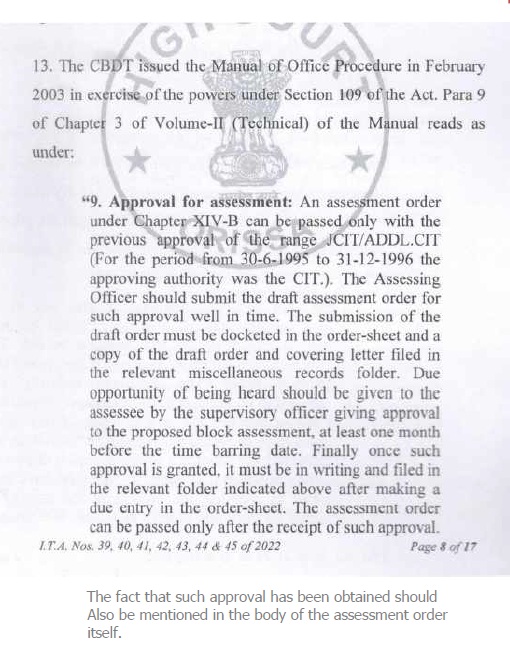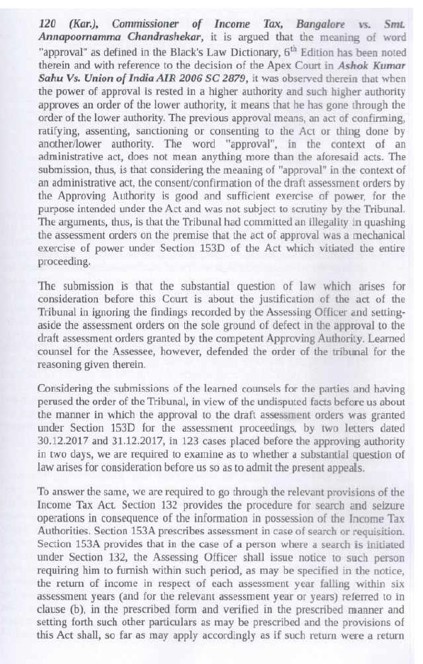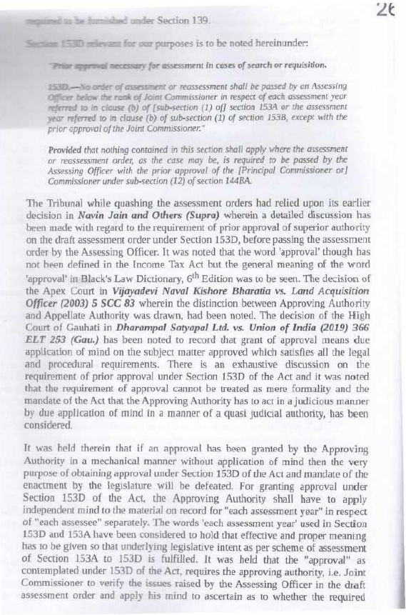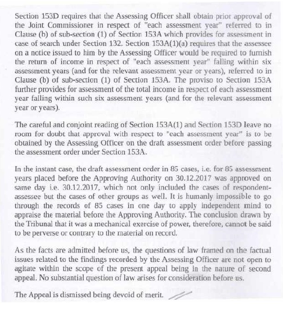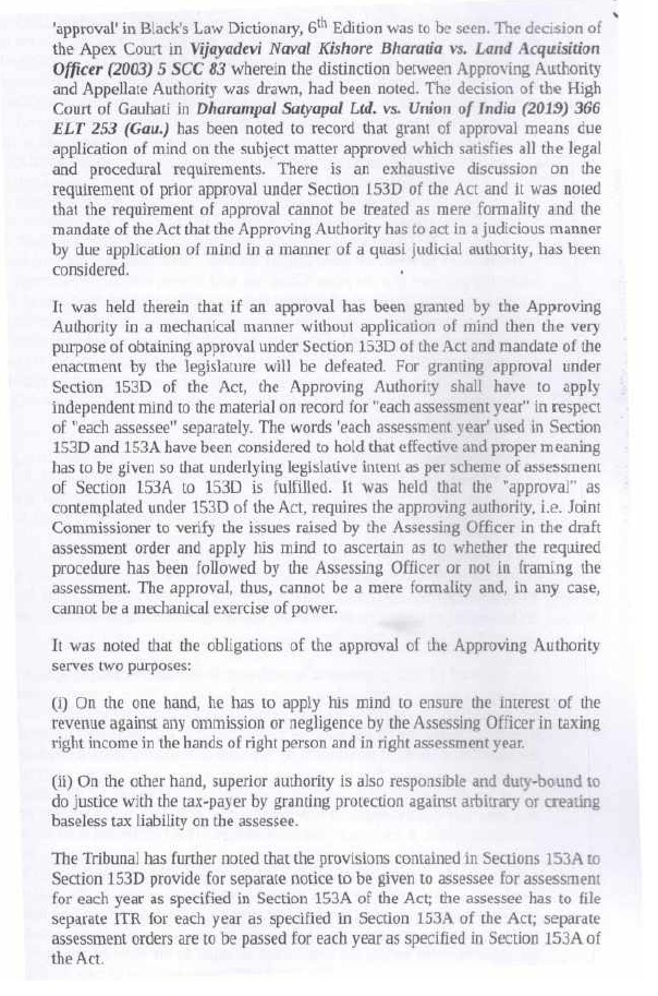 | (vi) | | Section 153D of the IT Act requires that the Assessing Officer shall obtain prior approval of JCIT in respect of each assessment year. Section 153D of the IT Act requires that the Assessing Officer would be required to furnish the return of income in respect of each assessment year. The proviso to section 153D of the IT Act further provides for assessment of the total income in respect of each assessment year. Careful and conjoint reading of section 153A and section 153D ofthe IT Act leave no room to doubt that approval with respect to each assessment year is mandatory. As separate returns are to be filed for each assessment year, and as separate assessment orders are to be passed for each assessment year; it follows that approvals u/s 153D of the IT Act are to be given by the approving authority separately for each assessment year. If approvals for multiple assessment years are given u/s 153D of the IT Act through a common letter of approval; this violates statutory requirements; and such approvals suffer from infirmity and are invalid. |