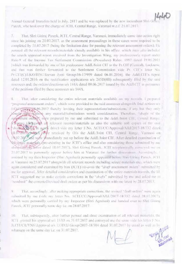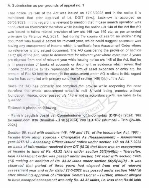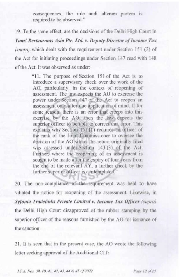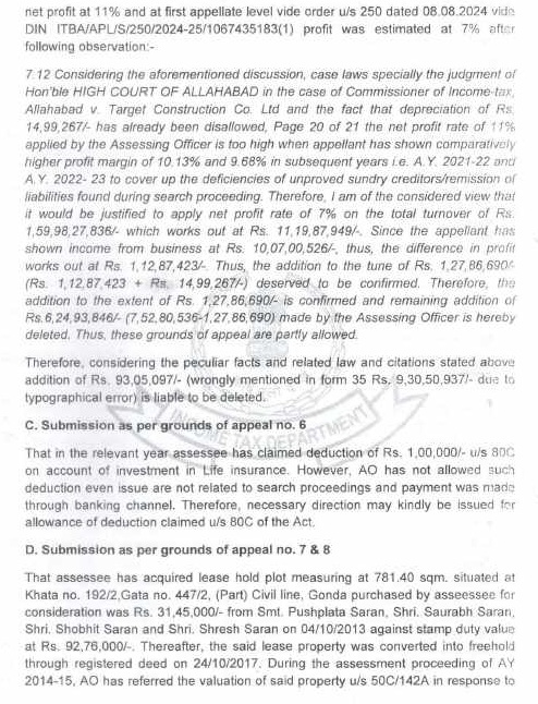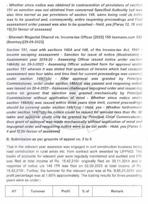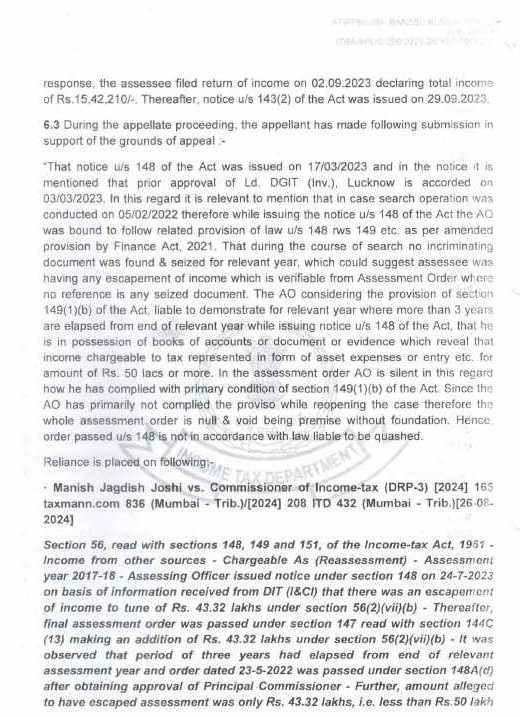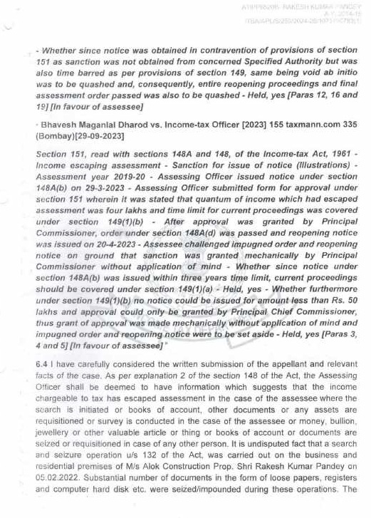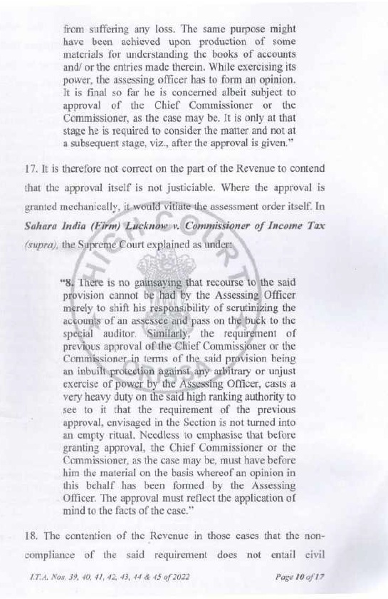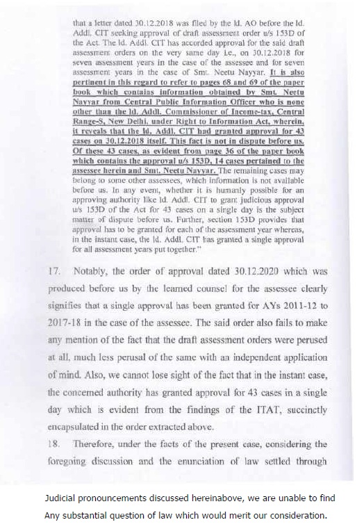 8.2 In the case of Pr. CIT v. Subodh Agarwal Principal Commissioner of Income-tax v. Subodh Agarwal (Allahabad), it was held by the Hon’ble Jurisdictional High Court that it was humanly impossible to go through the records of 38 cases in one day to apply independent mind to appraise the materials before the approving authority and the Hon’ble Allahabad High Court upheld the conclusion drawn by the Income Tax Appellate Tribunal that it was the mechanical exercise of power. The Hon’ble High Court upheld the order of the Income Tax Appellate Tribunal that the approval given in such a manner vitiated the entire assessment proceedings. Similar view was taken by Hon’ble jurisdictional High Court in the case of Pr. CIT v. Siddarth Gupta (Allahabad). In addition to the aforesaid orders of Hon’ble jurisdictional High Court, the issue is also covered in favour of the assessee by the orders of Co-ordinate Bench of the Income Tax Appellate Tribunal, Lucknow in the cases of Sapna Gupta v. DCIT (order dated 07.10.2021 in I.T.(SS)A.No.424/LKW/2019), Navin Jain v. DCIT (order dated 03.08.2021 in I.T.(SS)A.No.424/Lkw/2019), Rohit Gupta v. DCIT (order dated 04.07.2022 in I.T.A. No.115/Lkw/2021), M/s Quality Structure Pvt. Ltd. v. DIT (order dated 30.09.2024 in I.T. (SS)A.No.679 & 680). The SLP filed by Revenue on this issue was dismissed by Hon’ble Supreme Court in(SC).