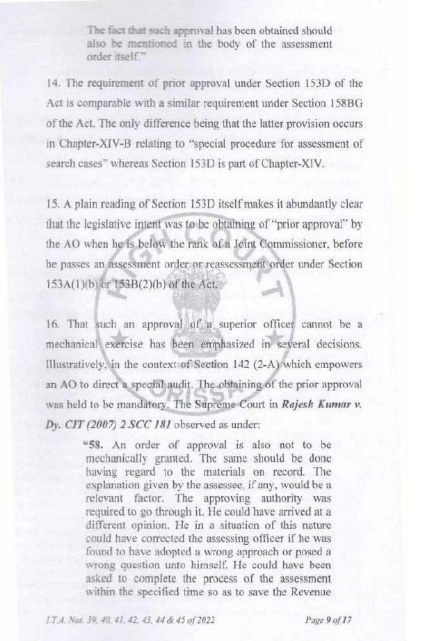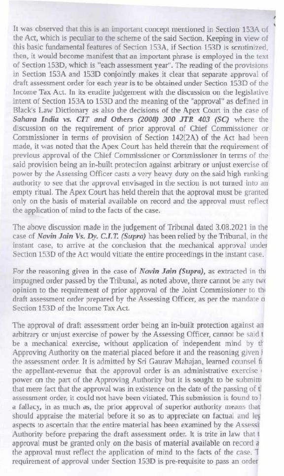 6. Per contra, the ld. CIT (D.R.) submitted that the assessee’s argument that the approval under Section 153D of the Act was granted mechanically without application of mind was not supported by the factual matrix of the case. The Ld. CIT(DR) prayed that the submission of assessee on the ground of mechanical approval under section 153D of the Act by Addl. CIT/ Jt. CIT before the Tribunal may kindly be rejected and the order of the Assessing Officer may kindly be upheld.