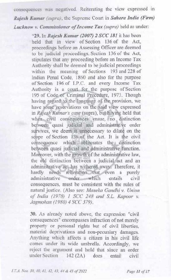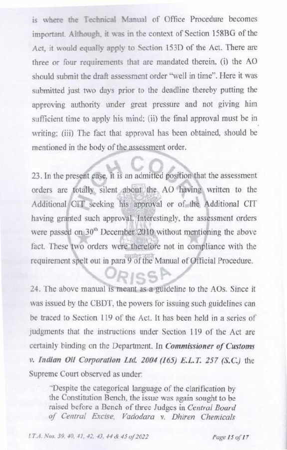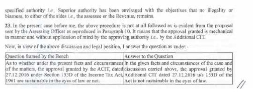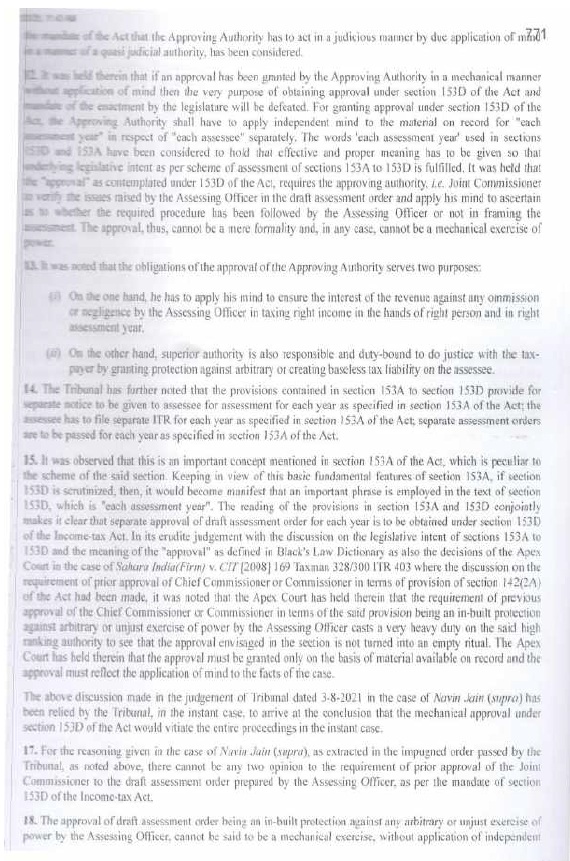| (viii) | | The Assessing Officer, while framing assessment, acts in quasijudicial capacity and he ought to conform to the more elementary rules of judicial procedure; and in particular, to conduct the case himself, and not allow somebody else, even his superior officer to interfere in the conduct of the case. Higher authorities an Assessing Officer, Addl. CIT/Joint CIT i.e. JCIT or CIT or CCIT are not entitled to interfere in process of framing of assessment order by the Assessing Officer; except by mandate of law. The Addl.CIT/JCIT is entitled to issue directions u/s 144A of IT Act. Other than that, his role starts when he receives draft assessment orders for approval u/s 153D of the IT Act (wherever such approval is required under law). When first draft is returned back; his role ceases; and the role of Add. CIT / JCIT starts again when he receives the final draft of the proposed assessment order, which he eventually approves. The question if the approval u/s 153D of the IT Act suffered from infirmity and was invalid is to be decided having regard to receipt of final draft of the proposed assessment order which the Addl. CIT /JCIT eventually approved. The association of Addl. CIT/JCIT with the Assessing Officer, and involvement of the Addl. CIT/JCIT in the assessment proceedings before that has no relevance for deciding whether approval u/s 153D ofthe IT Act suffered from infirmity and was invalid. In fact, in view of the foregoing discussion, any such association and involvement may, depending on facts and circumstances of the case, be fatal to the assessment on strict application of rules of judicial procedure as aforesaid; depending on facts and circumstances ofthe case. |