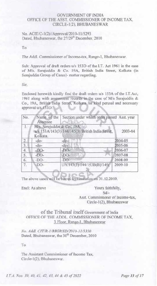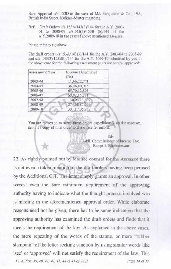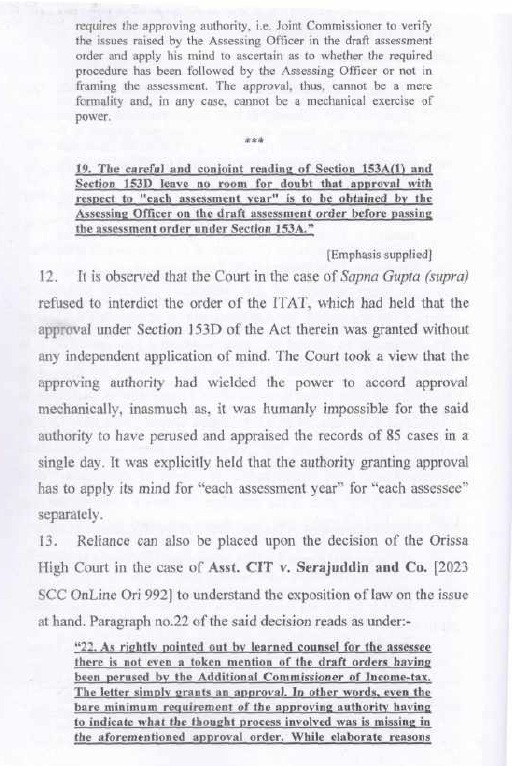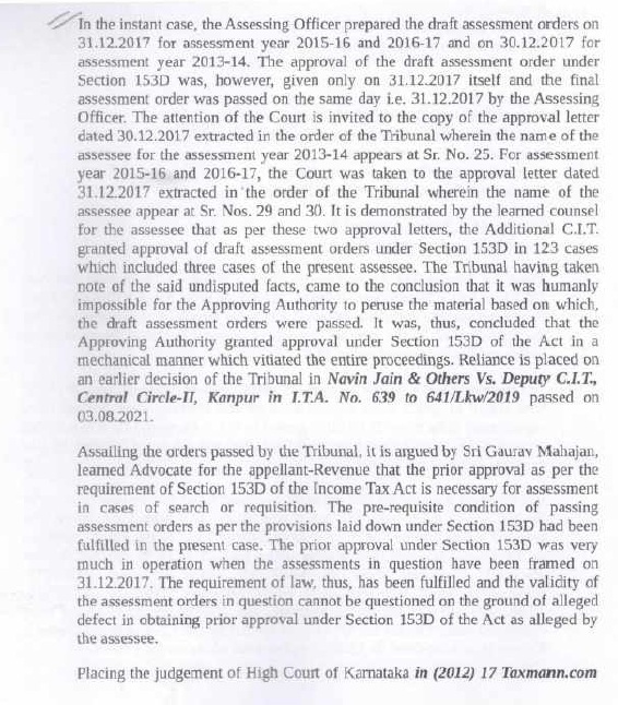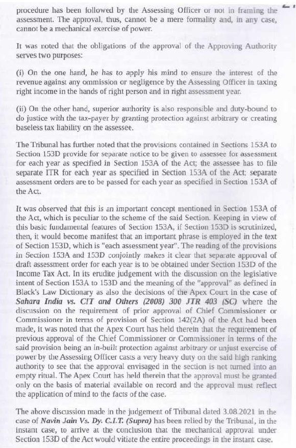 5.1 The Ld. A.R. invited our attention to the Letter of Approval under section 153D of the Act, dated 27.12.2019 of the Addl. Commissioner of Income Tax, Central Range, Kanpur (copy placed in the paper book) and submitted that the order dated 31.12.2019 passed by the DCIT, Central Circle-1, Kanpur under section 153A of the Act was based on the approval under section 153D of the Act granted by the ACIT, Central Range, Kanpur by a common order dated 27.12.2019 in cases pertaining to different assessees and different assessment years. He further submitted that the order passed by the DCIT within four days of approval granted by the ACIT, i.e. 27.12.2019, was without application of mind and without appreciating the facts and the same did not follow the mandate of section 153A of the Act. The Ld. A.R. in support of his arguments placed reliance on various case laws, which were placed in paper book.