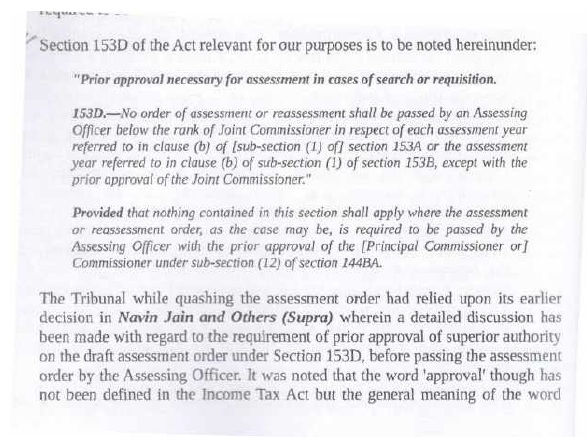 (C.4) The learned Departmental Representatives have also strongly contended that there was prior discussion between the Assessing Officer and the JCIT because of which it cannot be said that JCIT gave approval under section 153D of the Act without due application of mind. In our order in the case of Minto Developers Pvt. Ltd., we have discussed how consultation, between the JCIT and Assessing Officer prior to approval under section 153D of the Act was not only irrelevant for deciding whether the approval was valid; but also was fatal to the assessment order itself due to interference of JCIT during pendency of assessment proceedings before the Assessing Officer. The relevant discussion is in paragraph (K) of our order in the case of Minto Developers Pvt. Ltd. In this regard, we would like to add further that the meaning of approval was explained by Hon’ble Supreme Court in the case of Lord Krishna Textiles Ltd. v. Its Workmen [1961] 1 LLJ 211 (SC).[1961] 1 LLJ 211 (SC). The Hon’ble Supreme Court noted that approval, according to dictionary meaning, suggests that what has to be approved has already taken place; it is in the nature of ratification of what has already taken place. The word ‘approval’ in contradiction to the ‘prior permission’ shows that the action is taken first and ‘approval’ is to be obtained afterwards. It would logically imply that any role of JCIT in his association with the Assessing Officer, is de hors, his role and association as an approving authority under section 153D of the IT Act. His role prior to that of approval u/s 153D of the Act is that of general supervision of Assessing Officer; and it precludes interference in process of assessment. His legitimate role in the assessment is only as approving authority which begins only after the final draft of assessment order (eventually approved) is received at his end. Moreover, Hon’ble Punjab & Haryana High Court in a recent case reported at Findoc Finvest (P.) Ltd. v. DCIT FinDoc Finvest (P.) Ltd. v. Deputy Commissioner of Income-tax, Central (Punjab & Haryana) (Punjab & Haryana), held that where Assessing Officer was influenced by consultation and discussion with superior officer, assessment order could not be result of an independent application of mind but an order passed under influence and directions of superior officer. The assessment order was to be set aside. We also take guidance from case of DCIT v. Surendra Kumar Jain (dead) through legal heir (neutral citation 2024: CGHC:25811-DB) [2025] 472 ITR 346 (Chhattisgarh)/I.T.A. No. 6 of 2005, vide order delivered on 18/07/2024 in which Hon’ble Chhatisgarh High Court, after detailed discussion of numerous orders of Hon’ble Supreme Court and Hon’ble High Courts, upheld the quashing of assessment order by ITAT, and held that (i) In democracy like ours, every authority may, however high, should function within four corners of law because the rule of law requires that all the machinery of state must function according to mandate of statute (ii) Statutory authority cannot permit its decision to be influenced by dictation of superior as same would amount to surrendering of discretion (iii) General power of superintendence must be distinguished from the interference in the adjudication process (iv) The true test of bias is not whether the judge is actually biased or not, but whether there is a real danger of bias from view point of fair minded and informed observer.