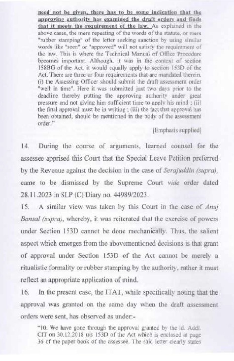 (C) There are two aspects of approval given by JCIT u/s 153D of the Act. The first pertains to the consequences that follow if approval given u/s 153D of the Act is found to be invalid. This is a question of law on which we must take guidance from binding precedents and decisions of higher forums. In the aforesaid order dated 30/09/2025 passed by us in the case of Minto Developers Pvt. Ltd. (supra), we have taken guidance from binding precedents of Hon’ble Allahabad High Court in the cases Principal Commissioner of Income-tax v. Sapna Gupta (Allahabad)/ Income Tax Appeal No. 88 of 2022) and also in the case of Principal Commissioner of Income-tax v. Siddarth Gupta ITR 534 (Allahabad)/Income Tax Appeal No. 90 of 2022). We have also taken guidance from binding precedents in a Third Member case of Income Tax Appellate Tribunal passed in the case of Dheeraj Chaudhary v. ACIT (Delhi-Trib.) (TM). We have further taken guidance from the order of Hon’ble Orissa High Court in the case of ACIT v. Serajuddin & Co.(Orissa)/ (in order dated 15/03/2023 in I.T.A. Nos. 39 – 45 of 2022) (Orissa). The Special Writ Petitions filed by Revenue against the aforesaid order of Hon’ble Allahabad High Court in the case of Siddarth Gupta (supra), and order of Hon’ble Orissa High Court in the case of Serajuddin & Co. (supra) have been dismissed by Hon’ble Supreme Court. We have further taken guidance from the order of Hon’ble Delhi High Court in the case of Pr.CIT v. Shiv Kumar Nayyar (order dated 15/05/2024 in I.T.A. No.285 9/467 ITR (Delhi)/ CM Appeal 28994/2024) (Delhi). In this case, Hon’ble Delhi High Court duly considered the aforesaid orders of Hon’ble Allahabad High Court in the case of Sapna Gupta (supra) and Hon’ble Orissa High Court in the case of Serajuddin & Co. (supra), and expressing agreement with the Hon’ble Allahabad High Court and Hon’ble Orissa High Court; Hon’ble Delhi High Court upheld the order of the Income Tax Appellate Tribunal, quashing the assessment order. Further, in the case of Sapna Gupra (supra), Hon’ble Allahabad High Court has approved the order of Income Tax Appellate Tribunal in the case of Navin Jain & Others quashing the assessment order for lack of valid approval under section 153D of the Act. We have also taken guidance from the case of Pr.CIT v. Anuj Bansal (Delhi)/466 ITR 251 (Delhi) in which Hon’ble Delhi High Court upheld the order of the Income Tax Appellate Tribunal quashing assessment order on the ground that there was absence of application of mind by the approving authority in granting approval under section 153D of the Act. SLP filed by Revenue against this order of Hon’ble Delhi High Court has also dismissed by Hon’ble Supreme Court. Further we have taken guidance from order of Hon’ble Delhi High Court in the case reported at Pr.CIT v. Pioneer Tour Planner (P.) Ltd. ITR 356 (Delhi) and in Pr.CIT v. MDLR Hotels (P.) Ltd.(Delhi); in which similar view was taken. We have, moreover, taken guidance from the order of Hon’ble Allahabad High Court in the case of Pr.CIT v. Subodh Agarwal (Allahabad High Court). In all the aforesaid precedents, the quashing of assessment order by ITAT due to lack of valid approval under section 153D of the Act has been upheld by Hon’ble High Courts. We may further point out that the view taken by Income Tax Appellate Tribunal in the case of aforesaid order dated 31/10/2025 in the case of Ramji Vaish (supra) is in complete contrast with order passed in the case of Satvik Polychem Private Limited (supra), relevant portion of which has been reproduced in foregoing paragraph (B.3.1) of this order. In the case of Satvik Polychem Private Limited (supra), the Bench of Income Tax Appellate Tribunal has approved the quashing of assessment order for lack of valid approval under section 153D of the Act. However, the same Members of the Tribunal, in the case of Ramji Vaish (supra) have taken a contrasting decision, restoring the matters back to the file of the Assessing Officer for seeking fresh approvals from the range head. In our respectful opinion, the Bench of Tribunal, consisting of the same Members, and falling under the Jurisdiction of the same jurisdictional High Court (i.e. Hon’ble Allahabad High Court) was bound by their own earlier decision in the case of Satvik Polychem Private Limited (supra) wherein they have quashed the assessment orders for lack of valid approval under section 153D of the Act unless they were forced to take a different view on the basis of a stronger precedent. Since the aforesaid order dated 31/10/2025 in the case of Ramji Vaish (supra) is in violation of the binding precedents and precedents of higher forums, as discussed above, we respectfully hold that the aforesaid order dated 31/10/2025 in the case of Ramji Vaish (supra) is not a useful precedent for deciding the present appeals before us.