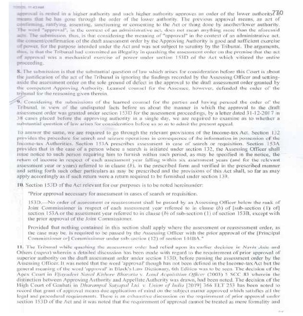 “5. The Ld. Authorized Representative for the assessee (Ld. A.R.) submitted that the assessee was challenging the validity of approval granted under section 153D of the Act in all the three appeals and prayed that this ground may be taken up first for hearing. Since the Department did not have any objection to the prayer, the Ld. A.R. proceeded to advance his arguments on the validity of approval under section 153D of the Act.