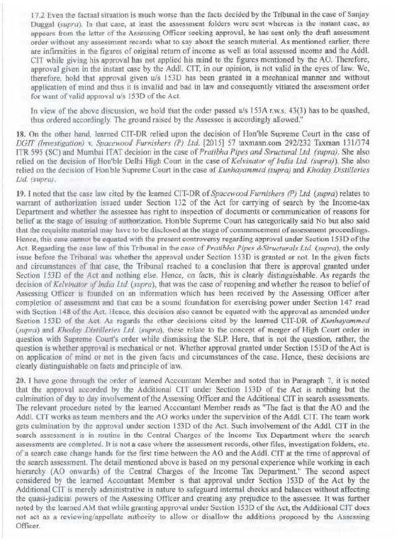 “(L) We accept the contention of the learned Departmental Representatives, as referred to in foregoing paragraph (H.1.1) of this order that whether in a particular case, JCIT had given approval u/s 153D of the IT Act after due application of mind, is a question of fact and the answer would depend on facts and circumstances of the particular case, independent of conclusion arrived at in any other case.