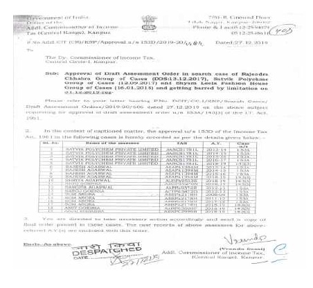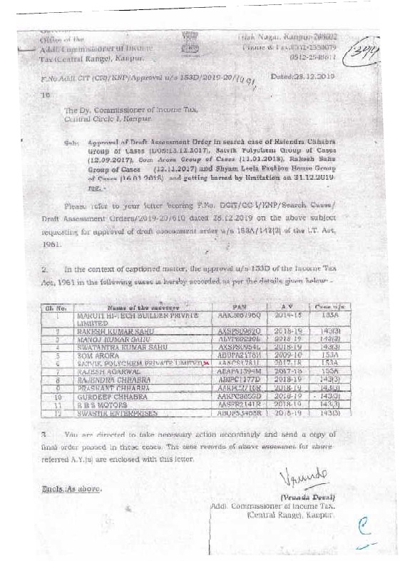 5.3 The Ld. A.R. also submitted a compilation of copies of approval letters dated 27.12.2019 and 2812.2019 issued by the Addl. CIT, Kanpur and submitted that on these two dates approval was granted in as many as 110 cases (including assessee’s) which would indicate that there was complete nonapplication of mind while according approval under section 153D of the Act.