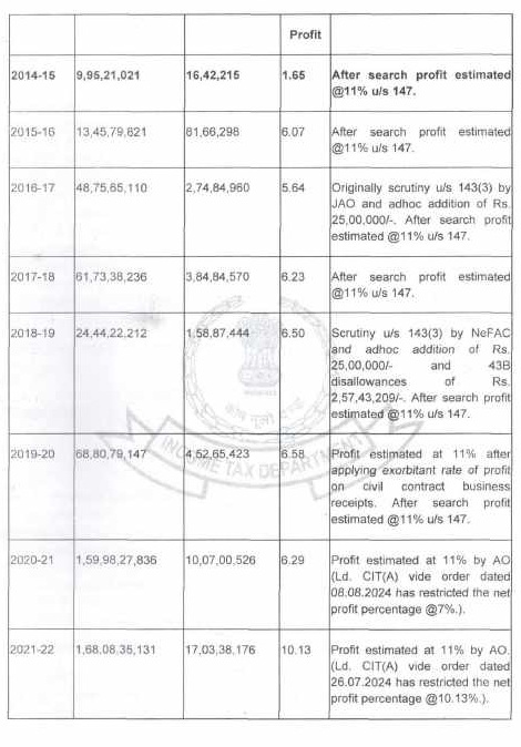 | 2018-19 | 24,44,22,212 | 1,58,87,444 | 6.50 | 11% | 7% | Erstwhile Scrutiny u/s 143(3) dt. 23.04.2021 by NeFAC and adhoc addition of Rs. 25,00,000/- and 43B disallowances of Rs. 2,57,43,209/-, Ld. CIT(A) allowed the appeal against original order. |