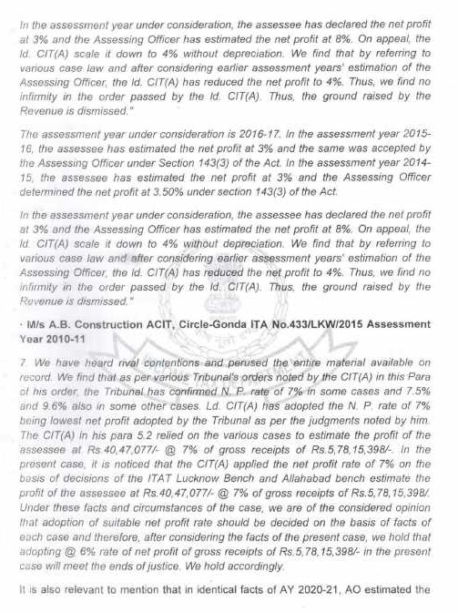 (L) In assessment year 2020-21 in Revenue’s appeal vide I.T.A. No.608/Lkw/2024, four disputes have been raised. The first issue is regarding net profit rate. The Revenue contends in its appeal that the net profit rate should not have been scaled down by learned CIT(A) from 11% as per assessment order. On this issue, facts and circumstances are in pari material with assessment year 2014-15, and no material has been brought for our consideration to take a different view in assessment year 2020-21. Therefore, consistent with our view for assessment year 2014-15, we direct the Assessing Officer to accept the net profit rates disclosed by the assessee.