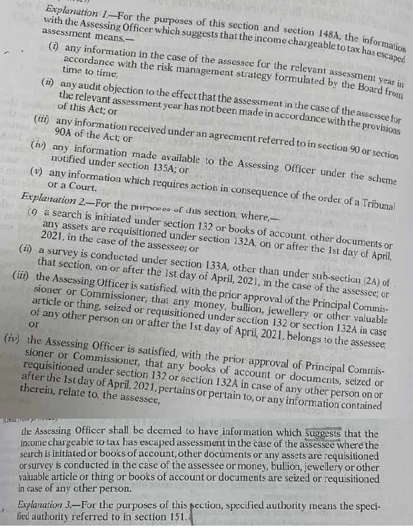 (F.2) We have heard both sides. We have perused materials on record. Relevant facts are not in dispute. It is not in dispute, that no incriminating material was found from the assessee’s premises during search under section 132 of the I. T. Act. Therefore, the Assessing Officer, in the absence of any such incriminating material; had no reason to believe that income had escaped assessment. The search under section 132 of the Act was conducted on 05/02/2022. Therefore, for the purpose of notice under section 148 of the Act read with section 147 of the Act, the provisions of law as amended by Finance Act, 2021 would prevail. The provisions of section 147 & 148 of the I. T. Act, as amended by Finance Act, 2021, and prevailing at the relevant time; are reproduced below: