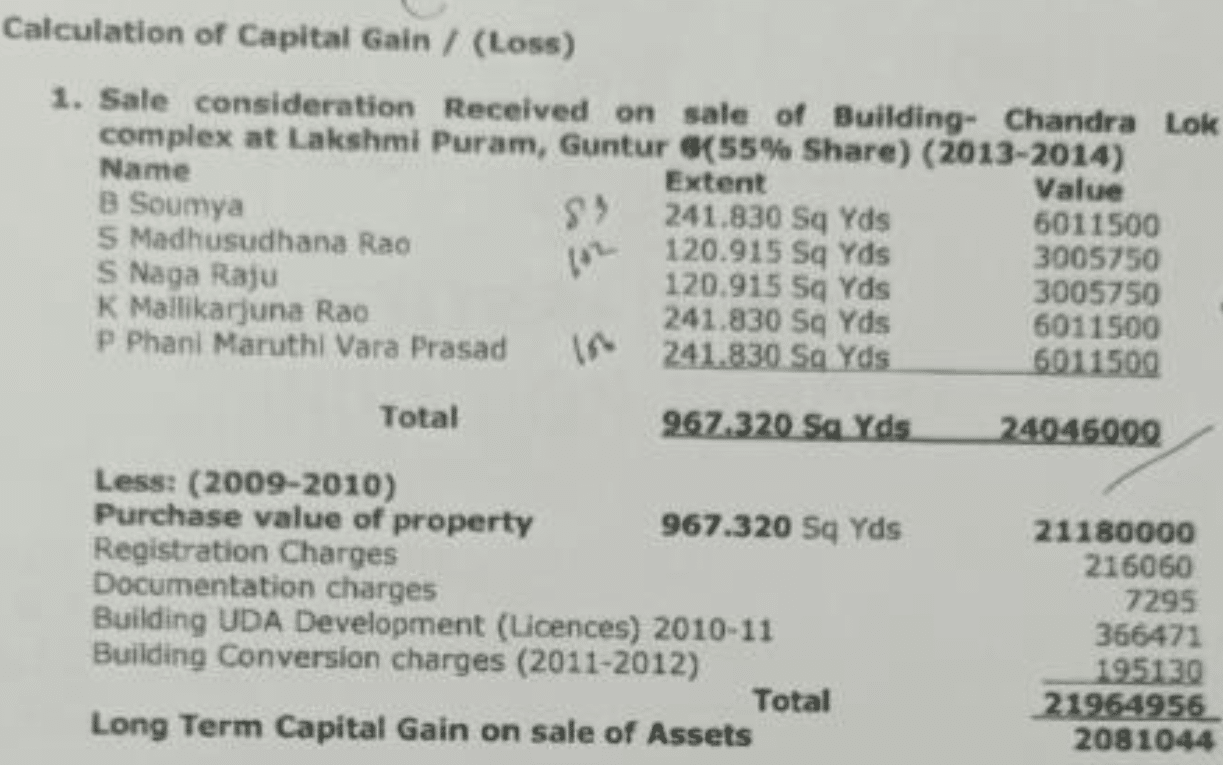 3. During the course of assessment proceedings, it was observed by the A.O. that the assessee company had purchased land admeasuring 967.32 sq. yards, situated at Door No. 5-87-126, Main Road, Lakshmipuram, Guntur, vide an agreement to sell cum General Power of Attorney dated 07.08.2009 for a total consideration of Rs. 2,11,80,000/-. Out of 967.32 sq. yards (supra), the assessee company had sold 82.28 sq. yards of land to M/s. Vishesh Engineering Company (for short “M/s. VEC”) on 16.04.2010, vide a registered sale deed no. 3628/2010 for a total sale consideration of Rs. 17,57,775/-.