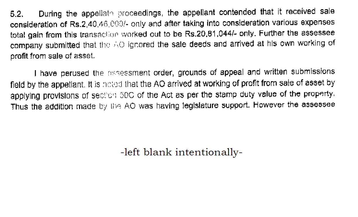 17. Ostensibly, as the assessee company, in the course of the assessment proceedings, had not objected to the adoption of the SRO value of the subject land by the A.O. for determining the capital gain arising on the transfer of the same to the five parties, therefore, we find no infirmity in the determining of the same under Section 50C of the Act by the A.O at Rs.66,67,806/-. However, we find substance in the Ld. AR’s claim that the A.O., without giving any cogent reason, had declined the specific claims for deduction of certain expenses that were considered by the assessee company while computing the capital gain on the transfer of 967.32 sq. yards of the subject property, viz. (i) building UDA development (licence charges) – 2010-11: Rs.3,66,471/-and (ii) building conversion charges (2011-12): Rs.1,95,130/-.