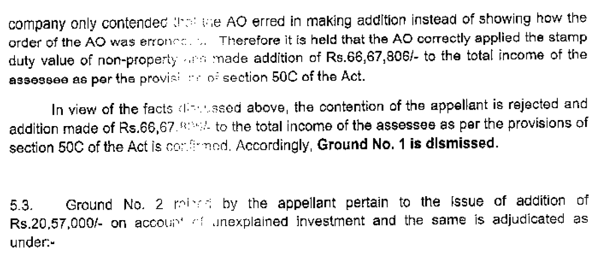 6. Thereafter, the A.O. observed that the assessee company along with the aforementioned Builder/Developer, viz. M/s. Pawan Constructions (supra) had sold the entire property consisting of 967.32 sq. yards and 27,794 sq. ft. of built-up area to five different buyers. On being queried, it was the claim of the assessee company that the 82.28 sq. yards of land that was transferred to M/s. VEC (supra), vide registered sale deed No. 3628/2010 dated 16.04.2010, was cancelled as the sale consideration was not received from the said purchaser. Accordingly, the assessee company explained that the total land admeasuring 967.32 sq. yards (885.04 sq. yards + 82.28 sq. yards) was developed and sold to five different buyers.