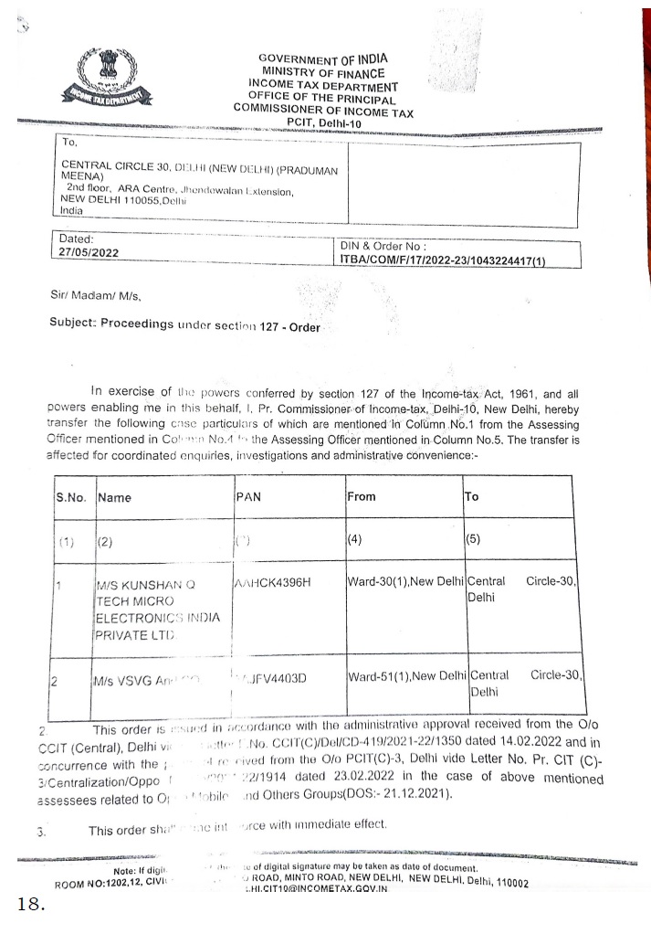15. In this case the order u/s. 127 of the Act was passed on 27.05.2022 by Ld. PCIT, Delhi-10 transferring the jurisdiction of the AO to assess the assessee from Ward-31, New Delhi to Central Circle-30, Delhi which is as under :-