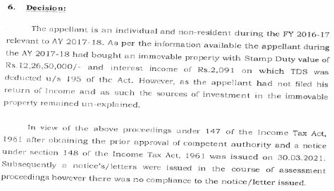 4. On the other hand, the learned DR has submitted that the assessee has not filed any return of income u/s 139 and even no return was filed in response se to notice u/s 148 of the I.T. Act. Therefore, when there is no compliance on behalf of the assessee to the notice issued by the Assessing Officer and no return of income was filed then, the objections raised by the assessee against the validity of the reopening of the assessment cannot be entertained and accepted. He has further submitted that the notice u/s 148 was issued by the Assessing Officer having geographical jurisdiction over the PAN of the assessee and thereafter, when it was found that the assessee is a Non-Resident-Indian, the matter was transferred to the concerned Assessing Officer and Faceless Assessment Centre. In support of his contention, he has relied upon the judgment of the Hon’ble Supreme Court in the case of Dy.CIT v. Kalinga Institute of Industrial Technology 493 (SC)/ dated 01/03/2023 in Special Leave Petition No.29304 of 2019 and submitted that the Hon’ble Supreme Court has reversed the order of the Hon’ble High Court whereby the assessment order was quashed on the ground that the jurisdictional Assessing Officer has not adjudicated upon the return. The jurisdiction has been changed after the return was filed. Therefore, once the assessee has not disputed the jurisdiction of the Assessing Officer, then the time limit as prescribed u/s 124(3) of the Act, the assessee cannot question the jurisdiction of the Assessing Officer. He has also relied upon the judgment of the Hon’ble Delhi High Court in case of Abhishek Jain v. ITO 405 ITR 1 (Delhi). The learned DR has pointed out that the learned CIT (A) has considered the relevant facts regarding the registration of the document and reporting of these documents by the Sub Registrar and given a factual finding that these documents were registered on 18th April 2016 and not on 24/03/2016 as claimed by the assessee. He has relied upon the impugned order of the authorities below.