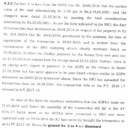 8. The learned CIT (A) has not disputed that these 2 documents being agreements of sale cum GPA were registered by the Registrar as document Nos. 2668 and 2669 of 2016 respectively. However, the learned CIT (A) has not accepted the fact that these documents were got registered on 24/03/2016 but it is held that these were registered on 18/04/2016. It is pertinent to note that as per the endorsement of the Jt. Sub Registrar, Balanagar, Ranga Reddy District, giving the details of registration at the back side of the first page of the document, these 2 documents were presented before the Jt. Sub Registrar on 21/03/2016 and were registered on 24/03/2016. The relevant details of registration of document Book No. as well as the date of registration are appearing at page Nos. 63, 65, 92 and 94 as under: