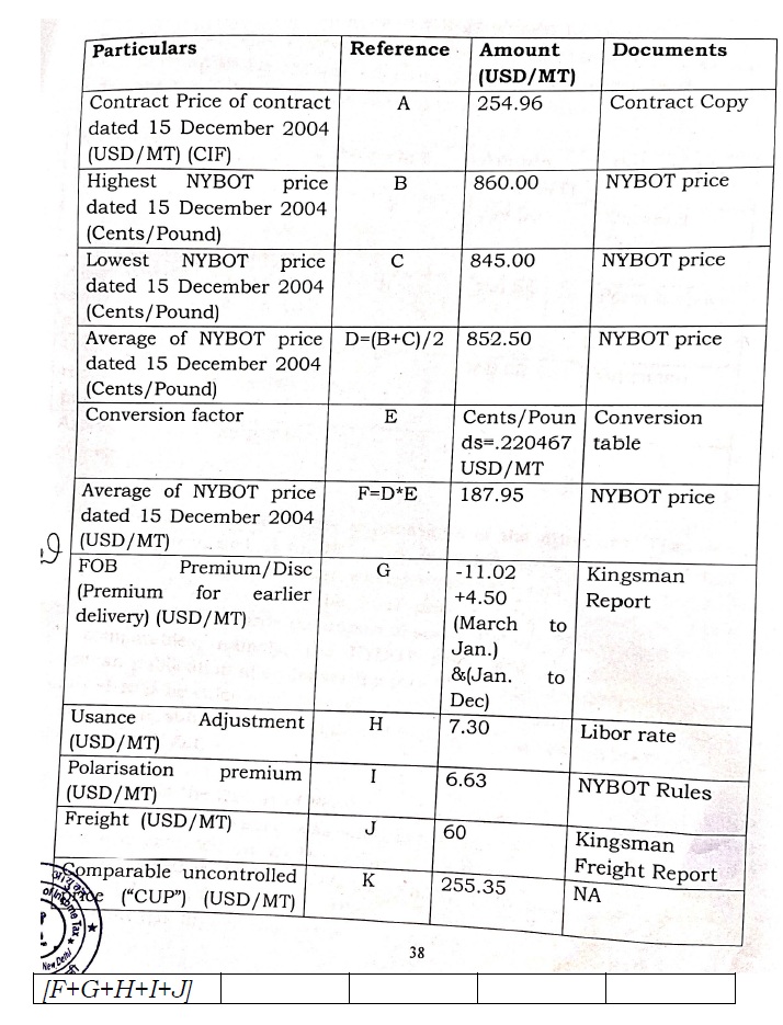 7.4 In addition to the above, the appellant has made an alternative submission that the arithmetical mean computed on the basis of price reported at NYBOT and Kingsman report should be used for comparing the contract price. The appellant has also clarified that the TPO has used Kingsman report for making adjustments to NYBOT price. In this regard the appellant has submitted the following chart:
