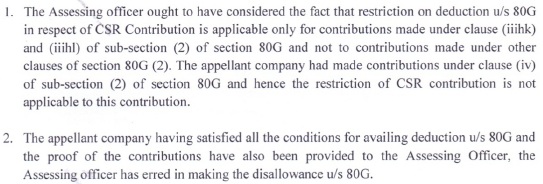 6. Before us, the ld. A.R. of the assessee vehemently submitted that the assessee company having satisfied all the conditions for availing deduction u/s 80G of the Act and the proof of the contribution have also been provided to the AO and therefore, the AO has erred in making the disallowance u/s 80G of the Act. Further, ld. A.R. of the assessee vehemently submitted that the restriction on deduction u/s 80G of the Act in respect of CSR contribution is applicable only for contribution made under clause (iiihk) and (iiihl) of sub-section (2) of section 80G of the Act and not to contribution made under other clauses of section 80G (2) of the Act. As the assessee company had made contribution under clause (iv) of sub-section (2) of section 80G of the Act and hence, the restriction of CSR contribution is not applicable to this contribution.