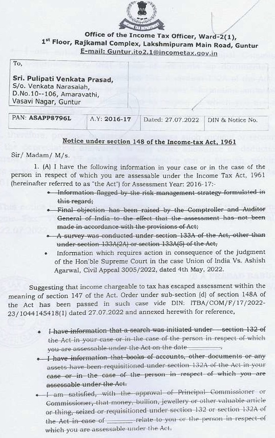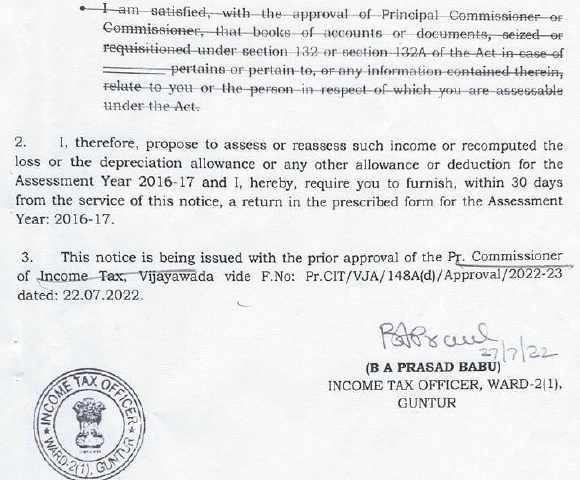 13. Admittedly, it is a matter of fact discernible from the record that the notice u/s 148 of the Act, dated 27.07.2022, had been issued by the ITO, Ward 2(1), Guntur, after obtaining the prior approval of the Pr. Commissioner of Income-Tax, Vijayawada, dated 22.07.2022 vide reference F. No: Pr. CIT/VJA/148A(d)/Approval/2022-23, dated 22.07.2022. For the sake of clarity, we deem it fit to cull out the notice u/s 148 dated 27.07.2022.