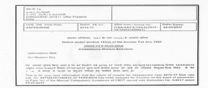 9. The case of the assessee was selected for scrutiny by issuance of a mandatory notice under section 143(2) dated 25.09.2017. In the said notice, it has been specifically mentioned that the case was selected on the basis of the return of income filed on 14.09.2016 and that the reason for selection falls under Para 1(i) of the Manual Compulsory Scrutiny Guidelines issued by the CBDT vide Instruction No. 5/2017 dated 07.07.2017. The said notice was issued by the DCIT, Central Circle, Noida, and a copy thereof is placed at page Nos. 126-129 of the Paper Book. The relevant snapshot is reproduced for your ready reference:-
