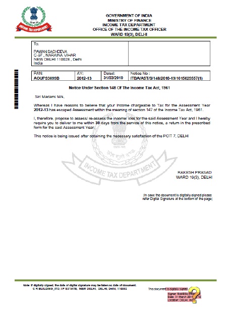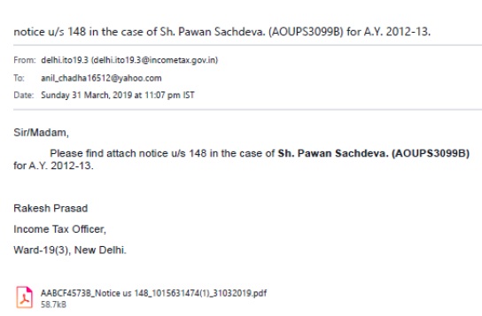 17. According to us petitioner’s objection regarding the invalidity of the notice on account of attachment of another assessee’s document is misconceived. A perusal of the e-mail dated 31.03.2019, on which reliance is placed by the petitioner, reveals that it contained the following assertion: “Please find attach notice u/s 148 in the case of Sh. Pawan Sachdeva (AOUPS3099B) for A.Y. 2012-13.”