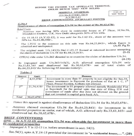3. The Ld. Counsel for the assessee at the outset submitted that in this appeal claim for exemption u/s.54 was denied to the extent of Rs.30,62,678/- on the ground that the assessee had invested in more than one property and therefore, not eligible for exemption u/s.54 for the investment made in the property at 1C, 1st Floor, Prasad Exotica, Kolkata. The exemption was granted only in respect of property namely residential flat at Supertech for the period of up to the date of filing ITR and investment made thereafter was not allowed on the ground that assessee has not invested in capital gain account.