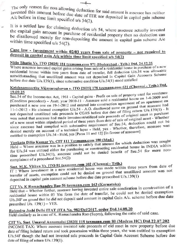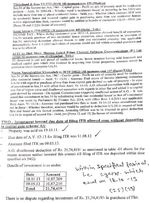 8. Further we observed that in various decisions it was held that investment made beyond due date for filing ITR even though not deposited into capital gains scheme as referred to in the submissions of the assessee is eligible for exemption u/s.54 of the Act. Thus, respectfully following the said decisions the AO is directed to consider the investments made by the assessee even beyond due date of filing ITR as specified in section 54(2) while allowing in the exemption u/s.54 of the Act.