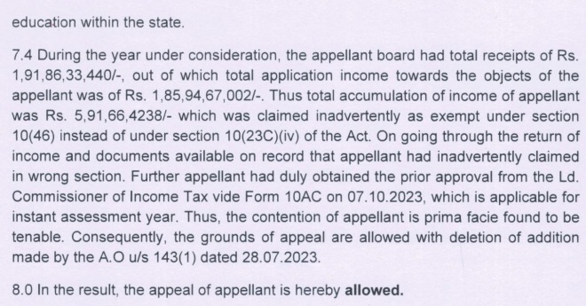 17. In view of the above discussion and considering the fact that the assessee has already been granted approval u/s 10(23C)(iv) of the Act for assessment years 2022-23 to 2026-27, therefore, merely because there was an inadvertent error on the part of the assessee by claiming exemption u/s 10(46) instead of u/s 10(23C)(iv), the assessee could not be deprived of the legitimate claim. We, therefore, we do not find any infirmity in the order of the Ld. Addl / JCIT(A) in granting exemption u/s 10(23C)(iv) of the Act. We, therefore, uphold the same and the grounds raised by the Revenue are dismissed.