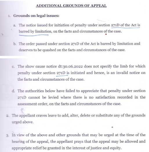6.2 Aggrieved by the order of ld. CIT(A)/NFAC, the assessee has filed the present appeal before this Tribunal. The assessee has filed a paper book comprising 22 pages enclosing therein copy of notice u/s 271D of the Act dated 30.6.2022, notification 803814(E) dated 17.9.2021 and 3 numbers case laws relied upon by the assessee. Before us, ld. A.R. of the assessee submitted that the order passed u/s 271D of the Act is barred by limitation and deserve to be quashed. Further, ld. A.R. of the assessee submitted that show cause notice dated 30.6.2022 does not specify the limb for which penalty u/s 271D of the Act is initiated and also there is no satisfaction recorded in the assessment order for which the penalty proceedings u/s 271D of the Act was initiated. Further, ld. A.R. of the assessee submitted that the assessee along with others has sold an ancestral property (agricultural property) for a total consideration of Rs.29,28,000/- in cash to an agriculturist(s) who are relatives (blood related) of the assessee. The assessee’s share out of total sale consideration of Rs.29,28,000/- is amounting to Rs.14,64,000/- and he has received his share of sale consideration in cash on a honest and Bonafide belief that sale proceeds received in cash from sale of agricultural land is not covered u/s 269SS of the Act. Further, the ld. A.R. of the assessee was under the honest and Bonafide belief that property in question was agricultural property and was sold to his relatives (blood related) who are also agriculturist(s) and therefore, the provisions of section 269SS of the Act will not apply in his case.