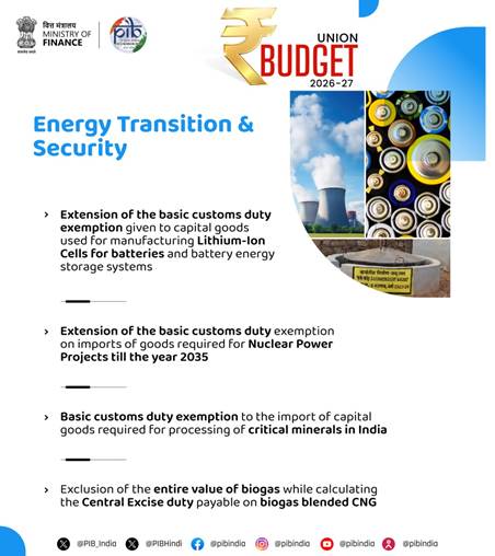 UNION BUDGET 2026-27 PROPOSES SEVERAL BASIC CUSTOMS DUTY EXEMPTIONS TO ENSURE ENERGY TRANSITION AND SECURITY