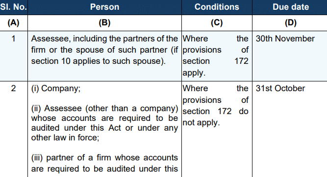 Ans. Section 263(1) of the Income-tax Act, 2025 prescribes the due dates for filing the return of income. The due dates are the same as under the old Act. Table for due dates as appearing in section 263(1)(c) [proposed as per Finance Bill, 2026] is as under: