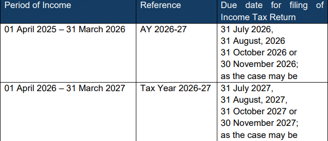 In simple words, the obligation to file the return for the Tax Year 2026-27 will arise after the end of the Tax Year. The Income Tax Returns, Forms etc. for the Tax Year 2026- 27 shall be notified by the Government well before the due dates.