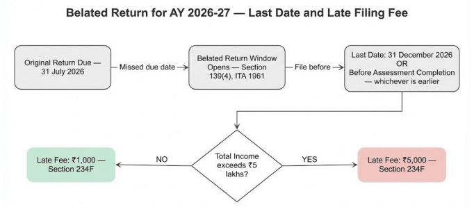Ans. Pursuant to Section 139(4) of the Income-tax Act, 1961, a belated return for Assessment Year (AY) 2026–27 may be furnished on or before 31st December 2026, or prior to the completion of the assessment, whichever occurs earlier. Further, in accordance with Section 234F of the Act, a fee for delayed filing shall be levied at ₹1,000 where the total income does not exceed ₹5,00,000, and ₹5,000 in all other cases.
