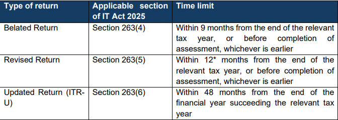 Q3.13 What are the time-limits for filing belated return, revised return and updated return in the Income Tax Act, 2025?