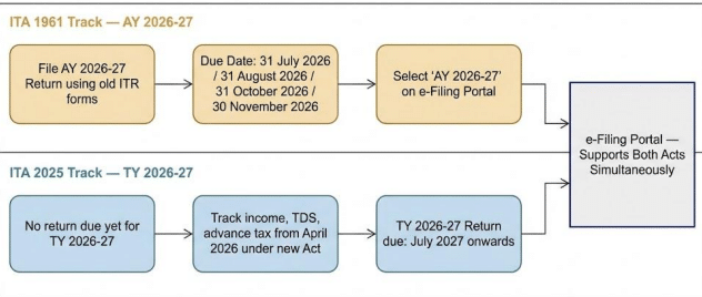 (ii) For Tax Year 2026-27 (income of FY 2026-27): This return is not due until July 2027. However, the taxpayer should keep track of income, TDS, and advance tax payments under the new Act framework from April 2026 onwards. The e-filing portal will support compliances under both the Acts simultaneously.