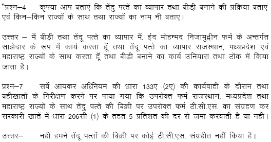 3. Briefly stated, the facts of the case are that the assessee is a partnership firm engaged in the business of manufacturing & trading of Bidi leaves at Tonk and Uniyara & in trading of Tendu leaves, which are mainly affected in states of Rajasthan, M.P (Betul) & Maharashtra. A survey under section 133A(2A) was conducted on 23.03.2015 at the business premises of the assessee and during the course of survey proceedings, it was found that the assessee firm has sold Tendu Leaves to various parties which falls under the category of forest produce and the assessee was required to collect tax at source as per the provisions of section 206C(1) of the Income Tax Act, 1961. During the course of survey, statement of Sh. Moinuddin, a partner of the assessee firm was also recorded and the relevant contents of the statement, reproduced in the assessment order passed under section 206C(6)/206C(7) dated 6-3-2017, reads as under:-