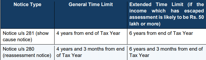 Additionally, Section 282(3) provides that no notice under Section 280 or 281 shall be issued within one year from the end of any tax year.